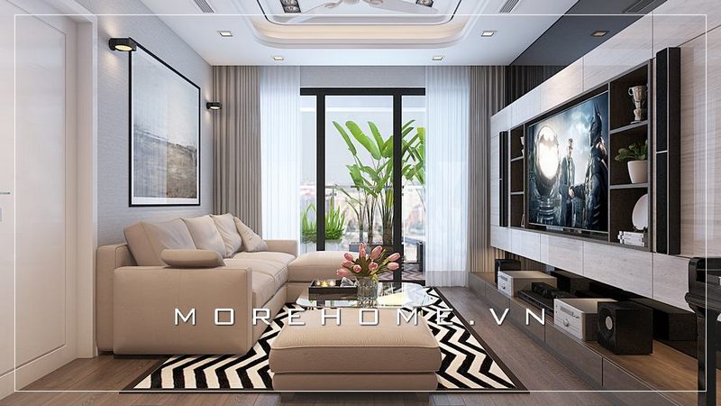Mẫu thiết kế phòng khách chung cư đẹp với bộ sofa bọc vài màu xám và trắng tạo điểm nhấn nổi bật cho căn phòng.