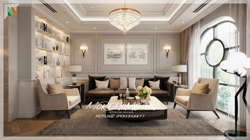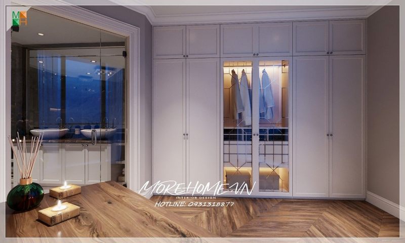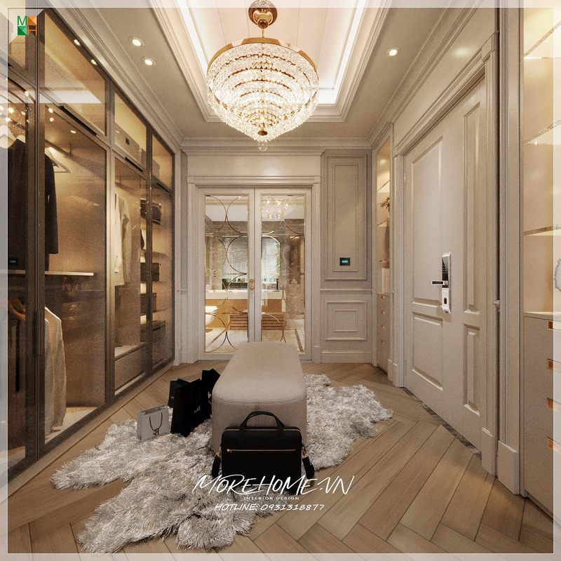 Phòng thay đồ trang trí nội thất được bố trí sắp xếp khoa học để đạt được hiểu quả cao, thuận tiện trong quá trình chọn lựa đồ dễ dàng