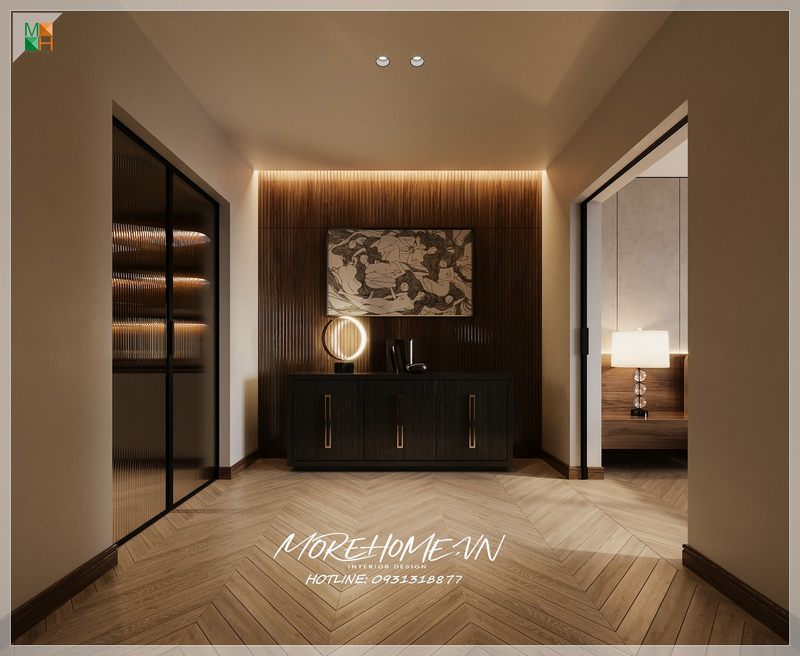 Sàn gỗ phòng thay đồ hình xương cá mang màu sắc trung tính góp phần làm tăng thêm tính thẩm mỹ và độ sang trọng cho căn phòng.