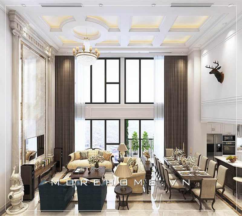 Sự kết hợp giữa phong cách tân cổ điển và phòng khách căn hộ chung cư thông tầng sẽ tạo ra một bức tranh đẹp mắt.