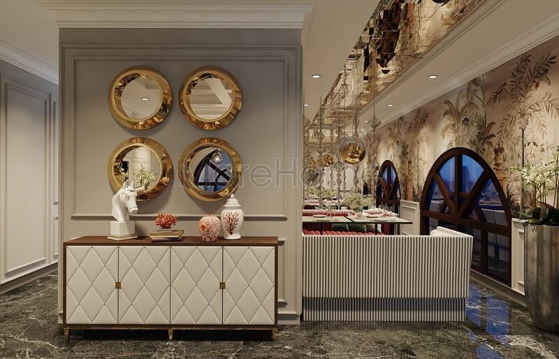 Nhà hàng được thiết kế theo phong cách tân cổ điển kiểu Pháp, được chỉnh sửa từng đường nét như đèn thả trần, gương decor, tranh và bộ bàn ghế nệm bàn ăn sử dụng chất liệu nỉ bọc sofa nệm cao cấp.