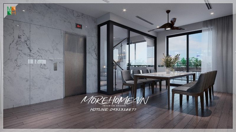 Để phân cách ngăn chia phòng ăn với cầu thang bên ngoài, một vách ngăn kính được sử dụng để tạo ra một không gian mở rộng, kết nối hai không gian gần nhau. Điều này đã được nhiều gia đình ưa chuộng bởi có độ chịu lực tốt, chống va đập và chịu trọng tải lớn, cũng như khả năng chống bể vỡ, mang lại an toàn tuyệt đối.