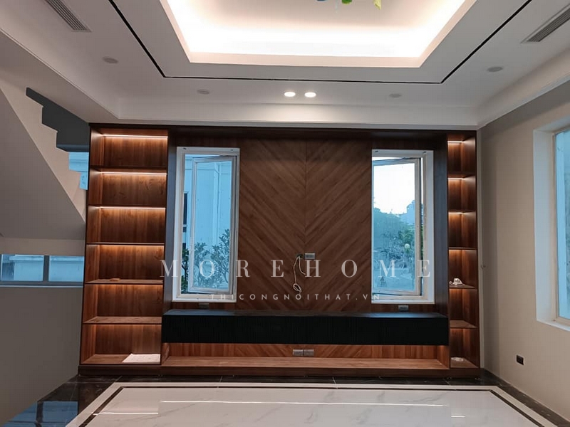 Thi công kệ tivi treo tường tiện nghi, sang trọng, không gian gọn gàng thẩm mỹ cao