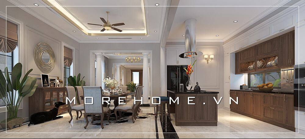 Thiết kế phòng bếp cao cấp với mẫu tủ bếp gỗ sồi sơn trắng tân cổ điển sang trọng
